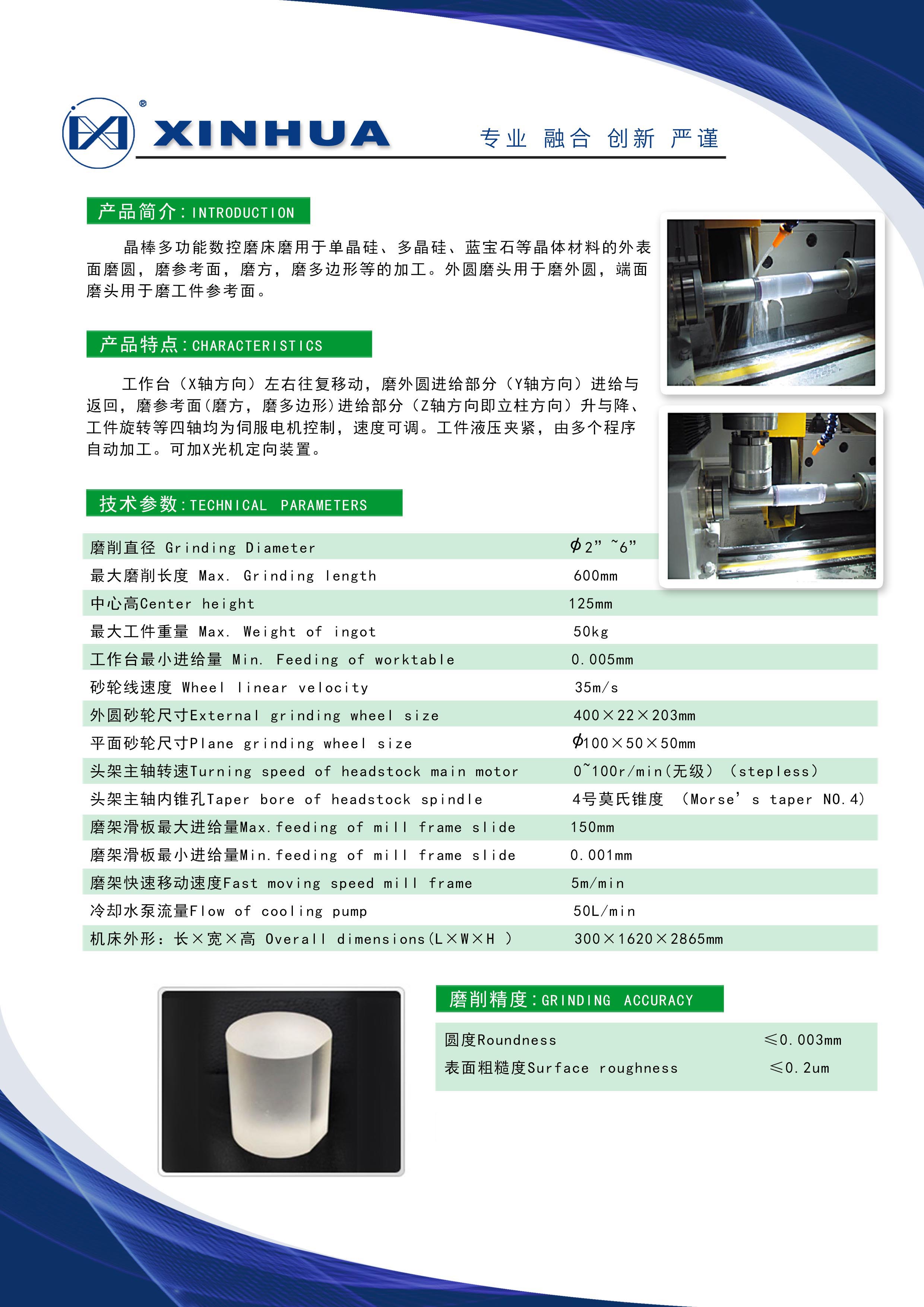 晶棒多功能數(shù)控磨床磨用于單晶硅、多晶硅、藍寶石等晶體材料的外表;面磨圓,磨參考面,磨方,磨多邊形等的加工。外圓磨頭用于磨外圓,端面磨頭用于磨工件參考面。